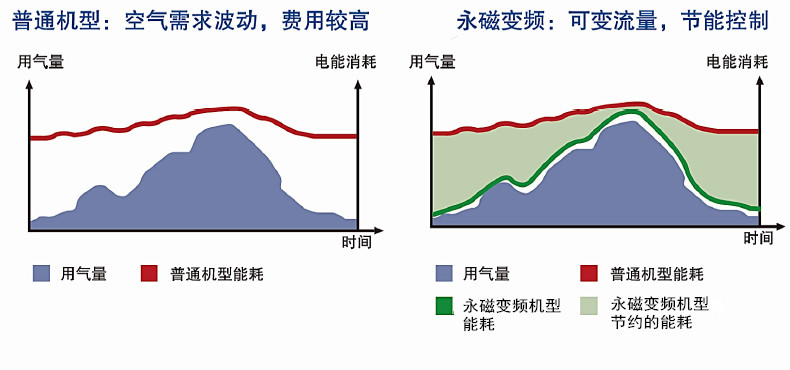 空壓機(jī)能耗費(fèi)用一般要占到使用周期整體費(fèi)用的82%左右,空壓機(jī)的電費(fèi)可能高達(dá)工廠全部電費(fèi)的40%以上。長期的跟蹤證明,大部分用戶的壓縮空氣需求在不同日期,不同時間或不同月份都有40%-80%的大幅波動。
